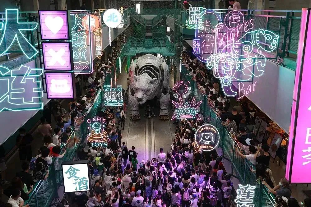 大連熊洞街由一個“熊北北”IP和兩條大街組成,包括巨獸巡游、主題游樂、時尚文創(chuàng)、科技研學(xué)、特色美食、嗨玩夜場、主題活動等元素,用文化科技藝術(shù)結(jié)合的方式,打造的一個尖叫地標(biāo),并通過巨熊北北這個超級IP,把文旅和商業(yè)業(yè)態(tài)有機融合到一起。大連熊洞街的核心IP巨熊北北身形巨大,據(jù)悉,“熊北北”是為大連專屬定制的城市IP,可實現(xiàn)高科技智能仿生互動效果,例如扮鬼臉、噴水噴霧、揮手互動,也是該項目的引流利器。