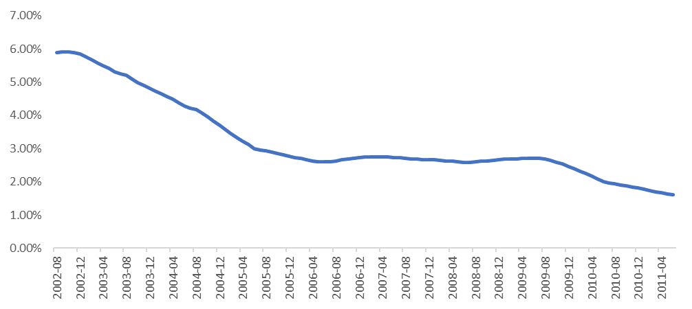 圖:2002-2011年經(jīng)濟適用房投資占地產(chǎn)投資比例